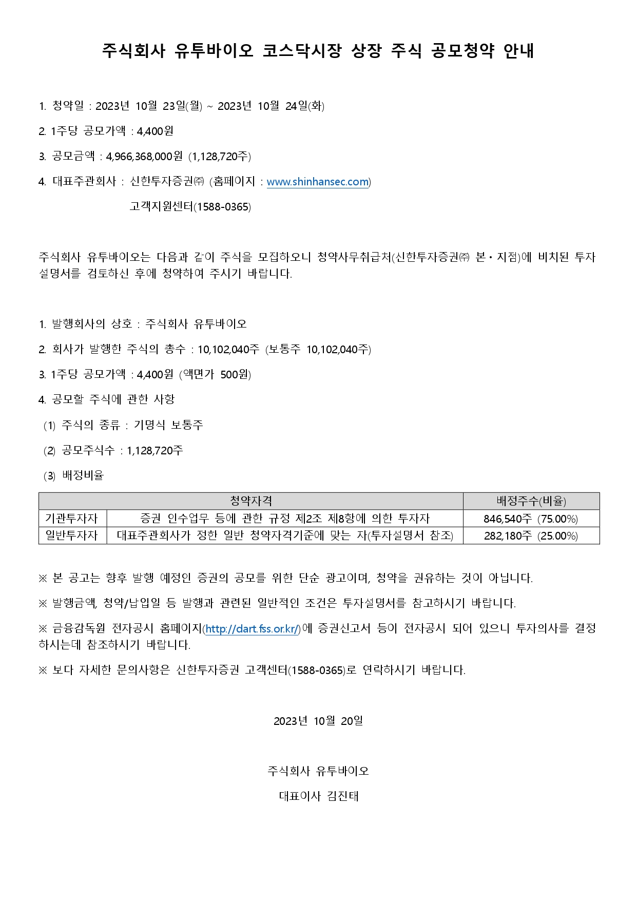 주식회사 유투바이오 코스닥시장 상장 공모 안내