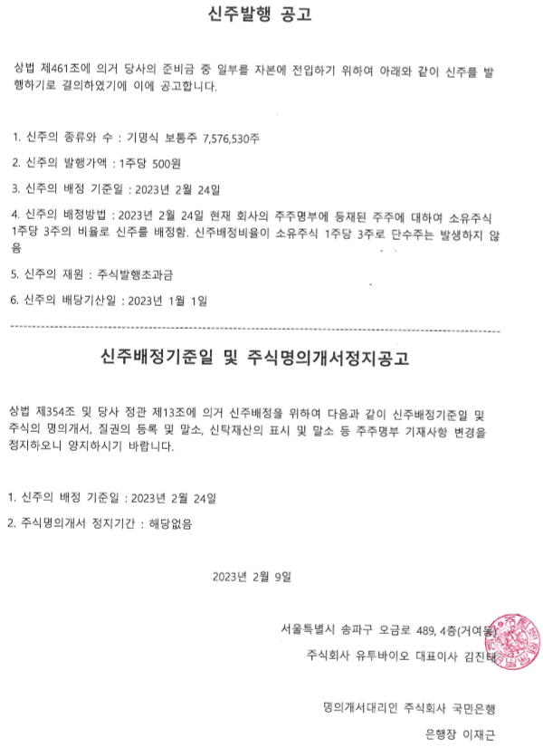 무상증자 결정 관련 신주발행 및 주식명의개서정지 공고